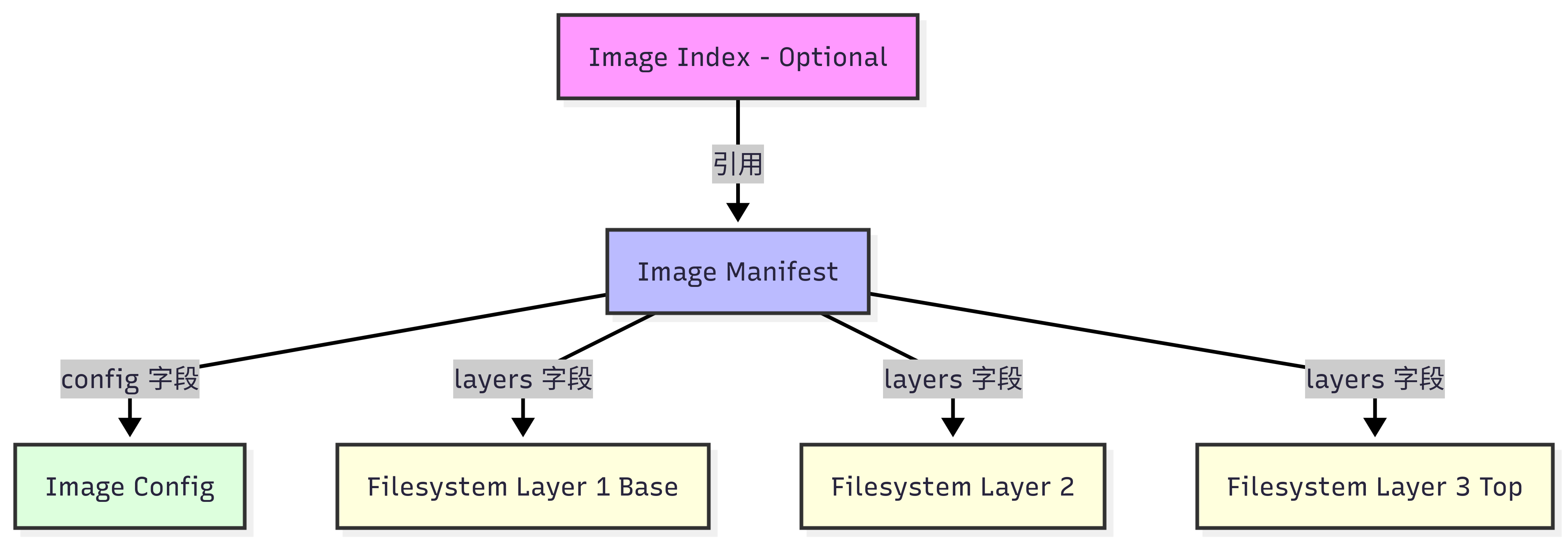 - Image Index (镜像索引): (可选) 指向多个 Manifest 的列表,通常用于支持多架构(如