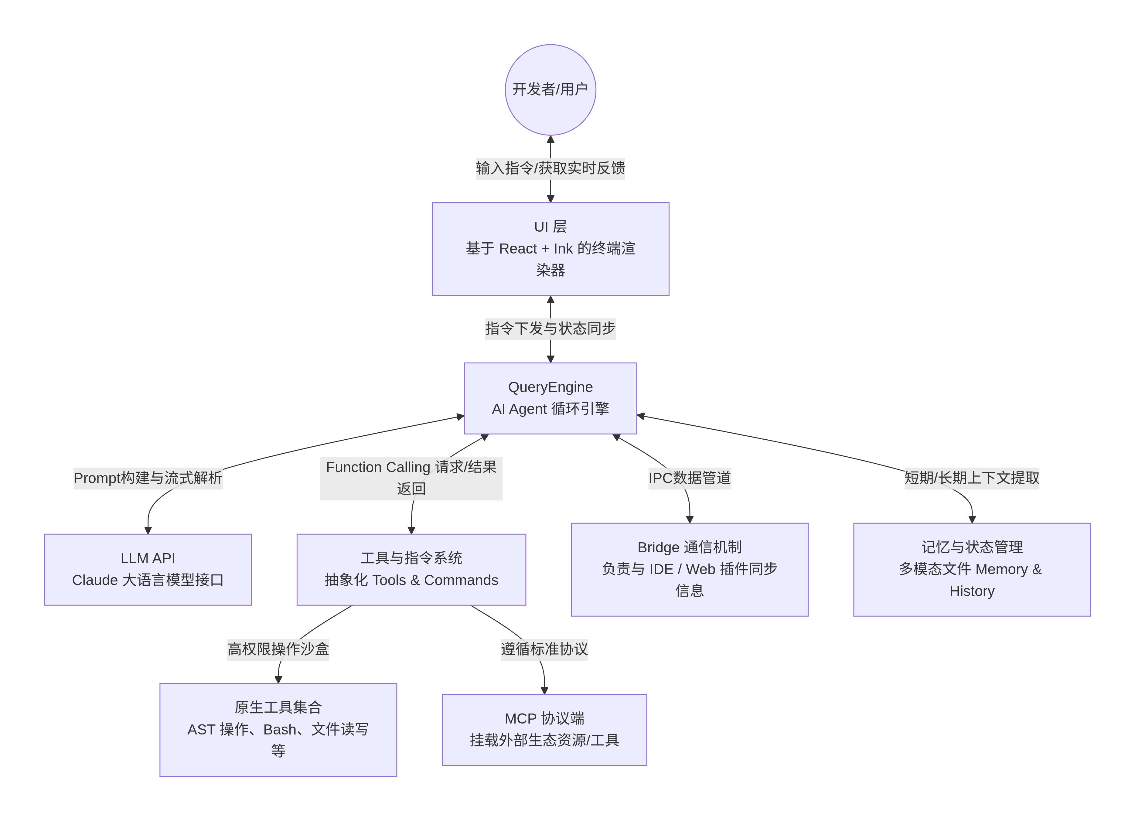 总体而言,架构从视觉交互一直到底层协议通信清晰地被划分除了四个层级:UI 层、控制引擎层 (QueryEngine)、执行层 (Tools & Tasks) 以及 **基础设施服务 (Bridge & MCP)**。